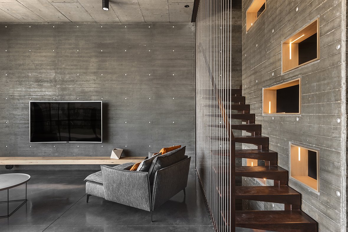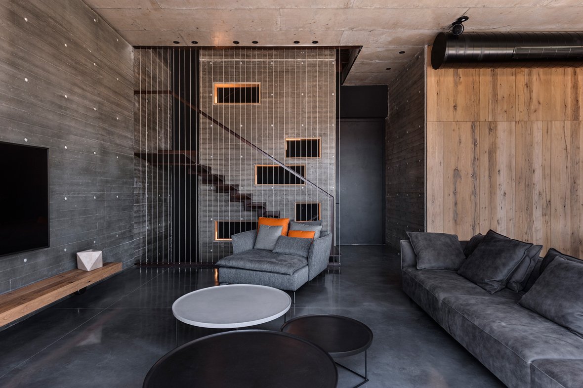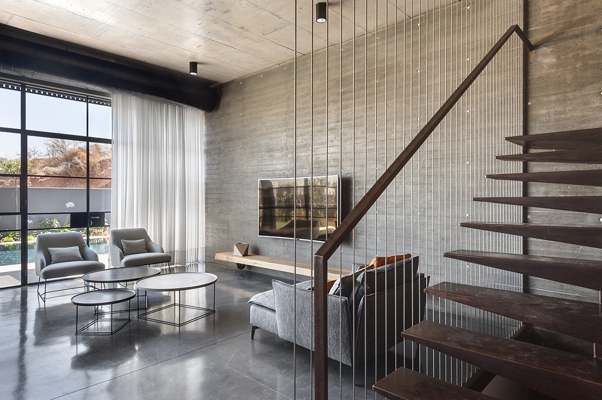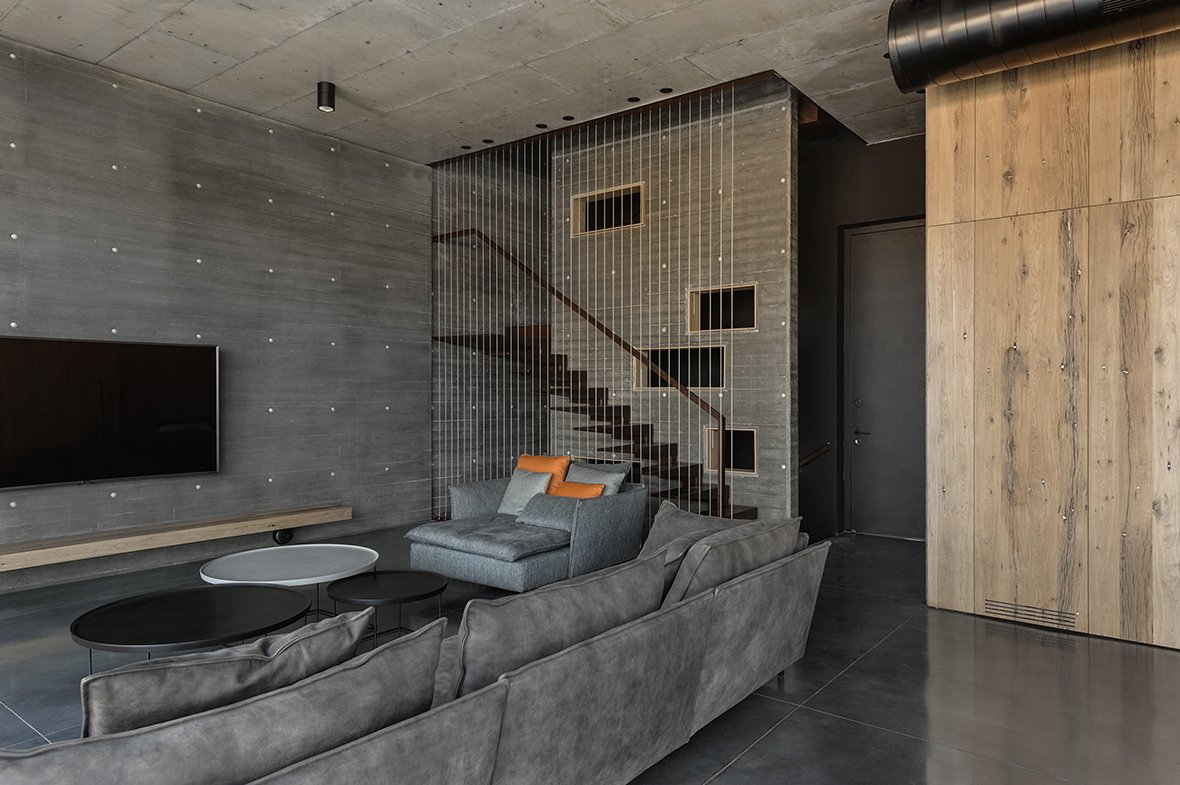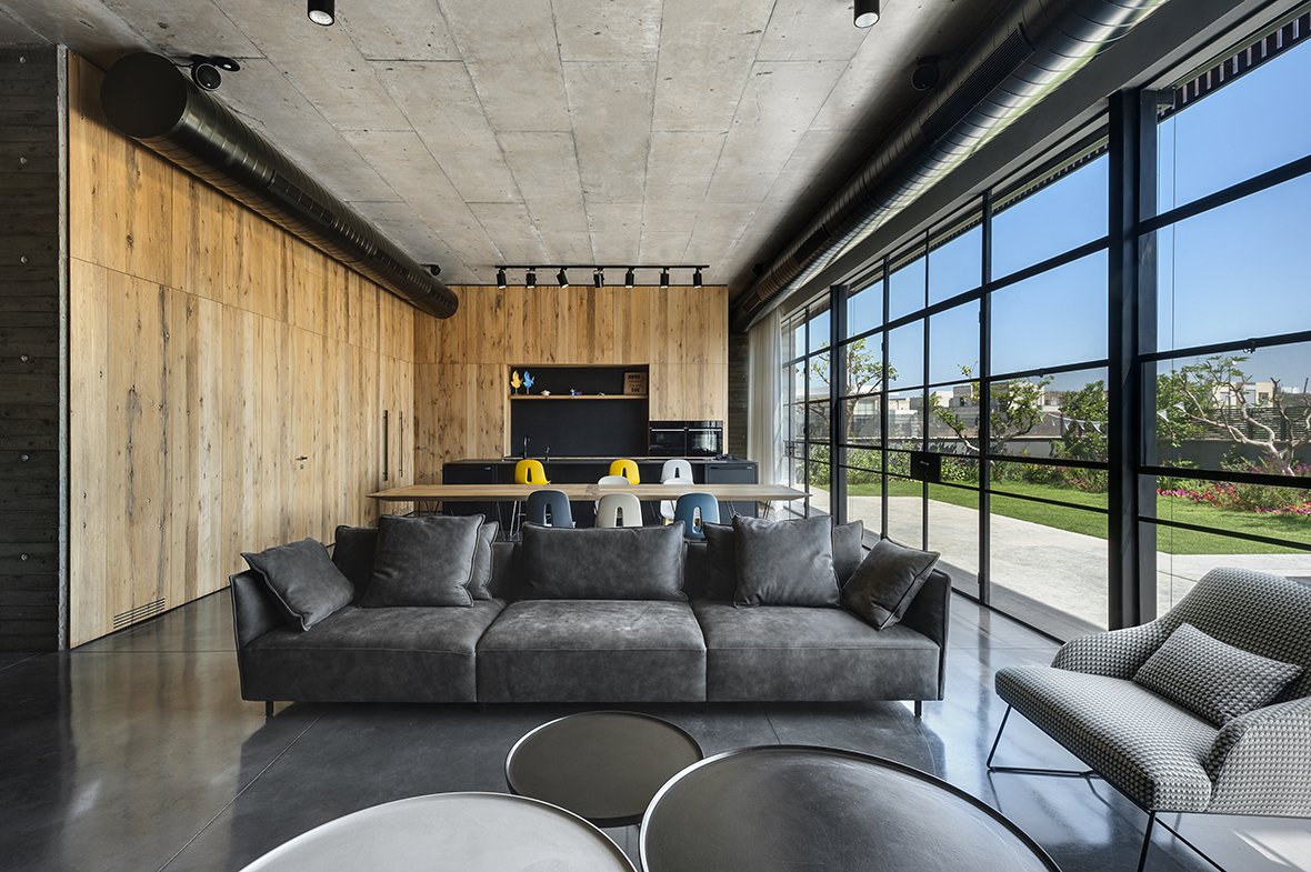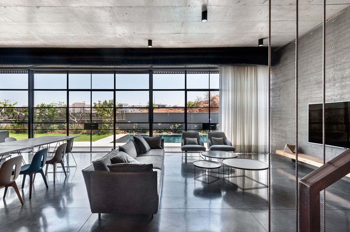בסלון נבחרו רהיטים בגוונים מונוכרומטיים של שחור, לבן ואפור, כך שהצבע העיקרי החלל הוא זה שנשקף דרך החלונות הגדולים, הפונים לכיוון החצר האחורית והבריכה. במקביל לפינת האוכל ומול הטלוויזיה שתלויה על קיר הבטון, הוצבה ספת Anushka רחבה ועמוקה במיוחד. לימינה נבחרו צמד כורסאות Pink הפונות אל גרם המדרגות הייחודי ולשמאלה מרבץ Anushka מפנק הפונה לכיוון הגינה המטופחת. במרכז, שלישיית שולחנות קפה מדגם Tass, המחופים בגוונים שונים של בטון ומשלימים את בחירת החומרים בחלל.