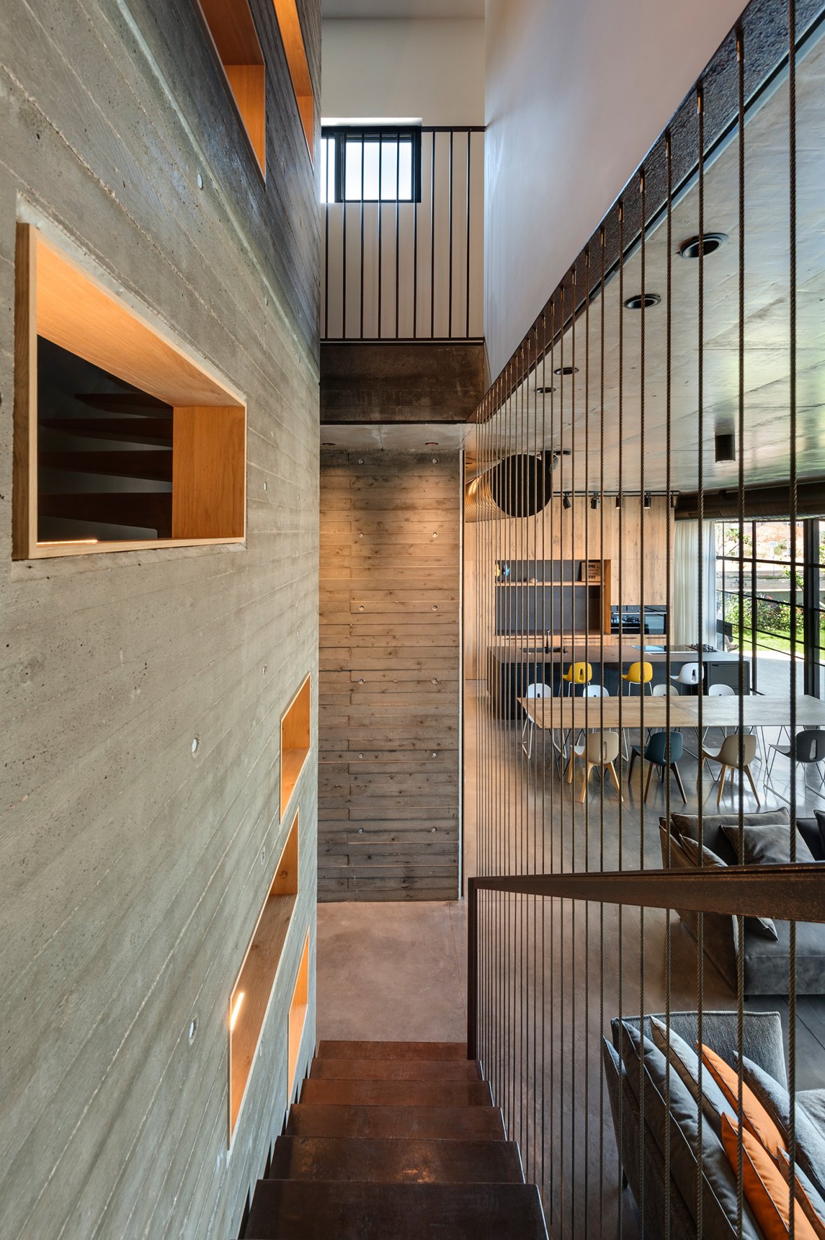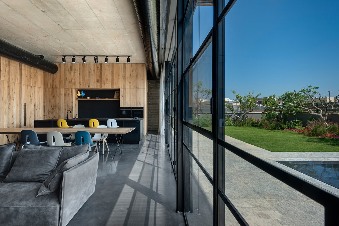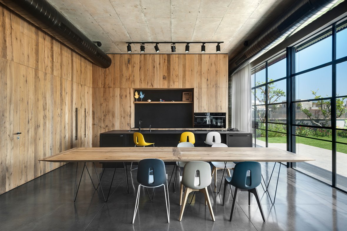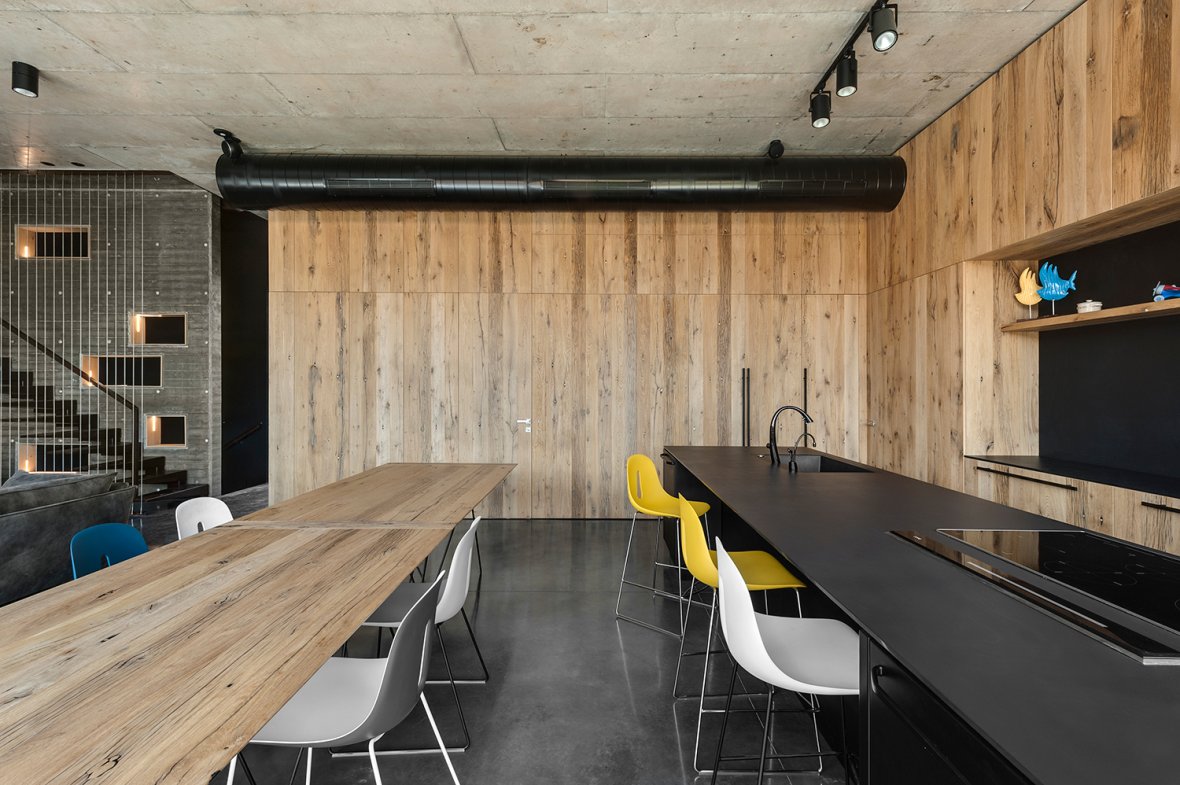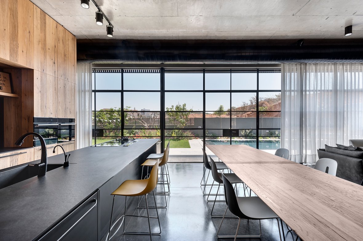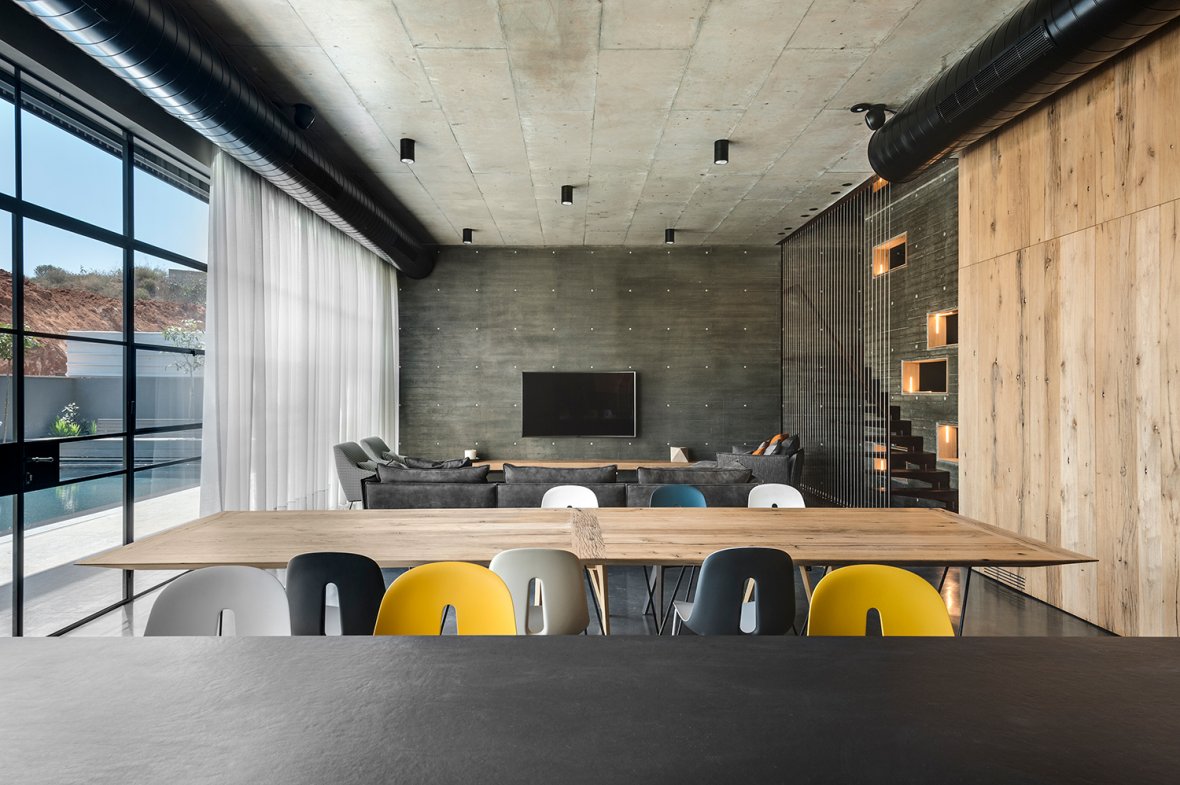 בית חדש ביישוב אירוס שתוכנן ועוצב על ידי הילה ודן ישראלביץ', ברובו על טהרת הבטון המודרניסטי והאדריכלי. הבית תוכנן עבור משפחה בת חמש נפשות ועוצב כקובייה נקייה ומרשימה. החזית הקדמית אטומה כמעט לגמרי כלפי חוץ ומייצרת סקרנות ומסתורין לקראת הכניסה לבית, הנפתחת למול חלל רחב ידיים עם תקרה גבוהה. בצידו האחד המטבח, בצידו השני הסלון וביניהם חוצצת פינת האוכל. כדי לאזן את מראה הבטון החשוף, עוצב המטבח מעץ בגימור טבעי ולצד האי שולבו כיסאות בר צבעוניים מדגם Gotham, כיסאות מאותו דגם נבחרו גם עבור פינת האוכל כדי לייצר מראה המשכי ביניהם.