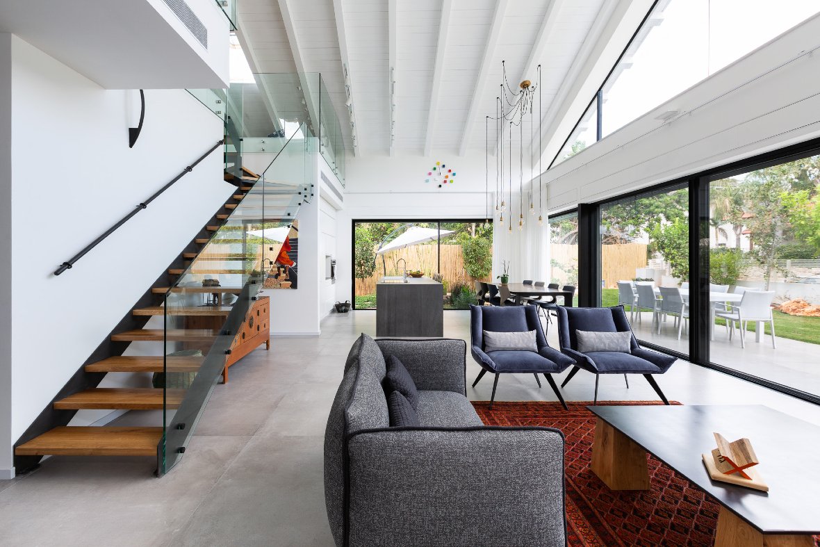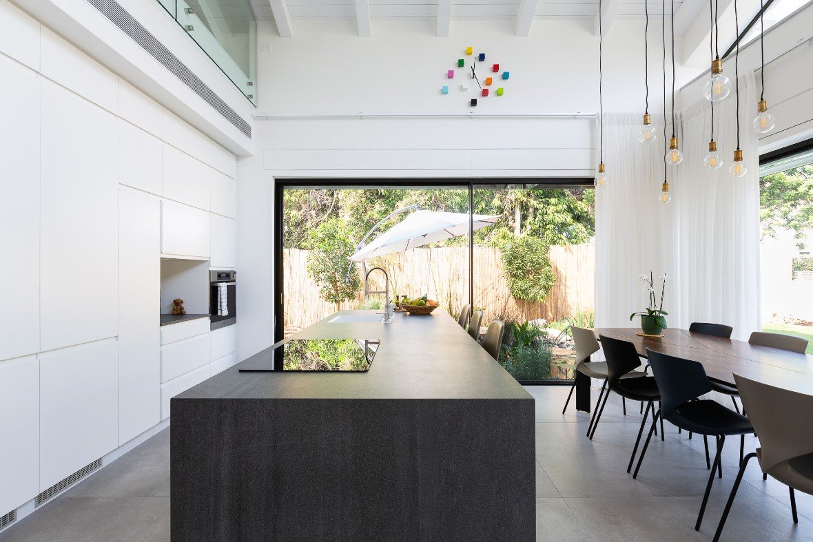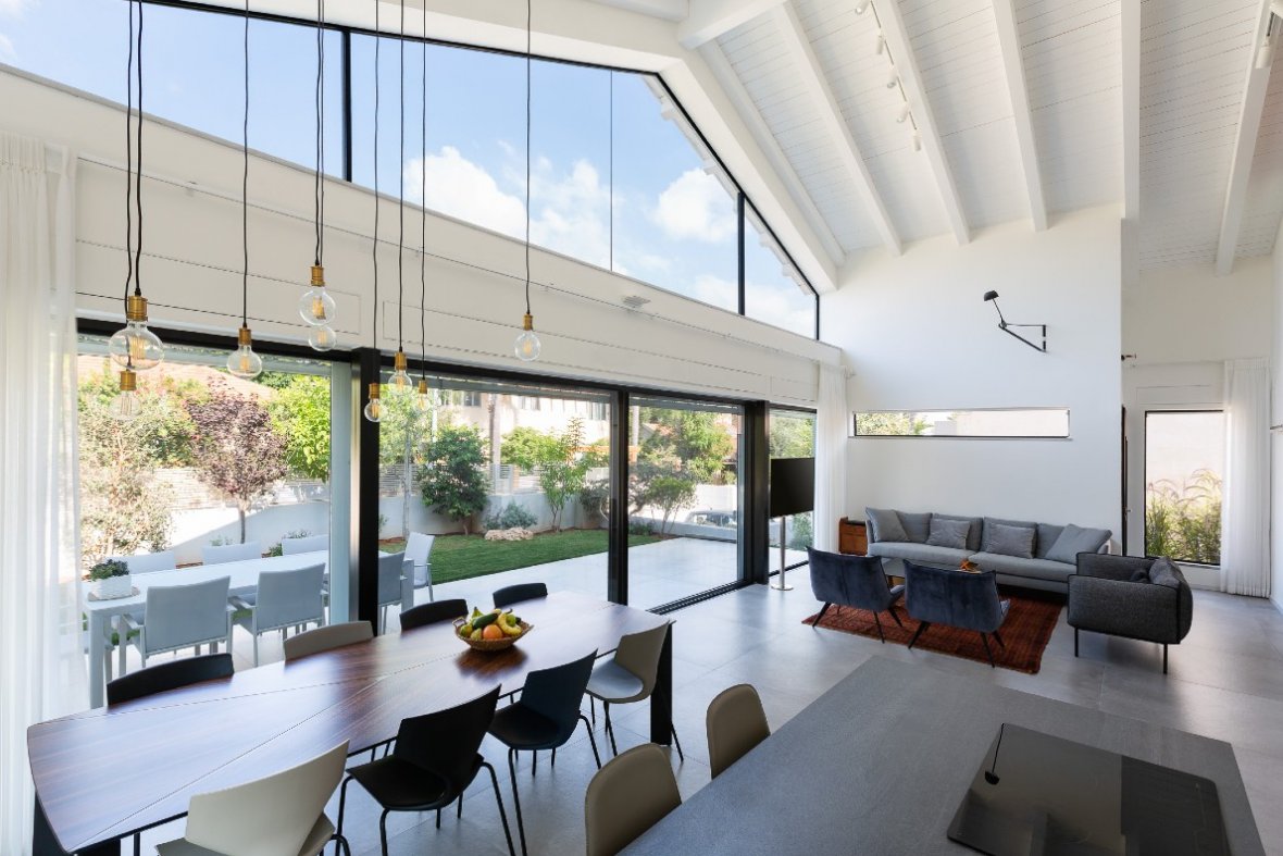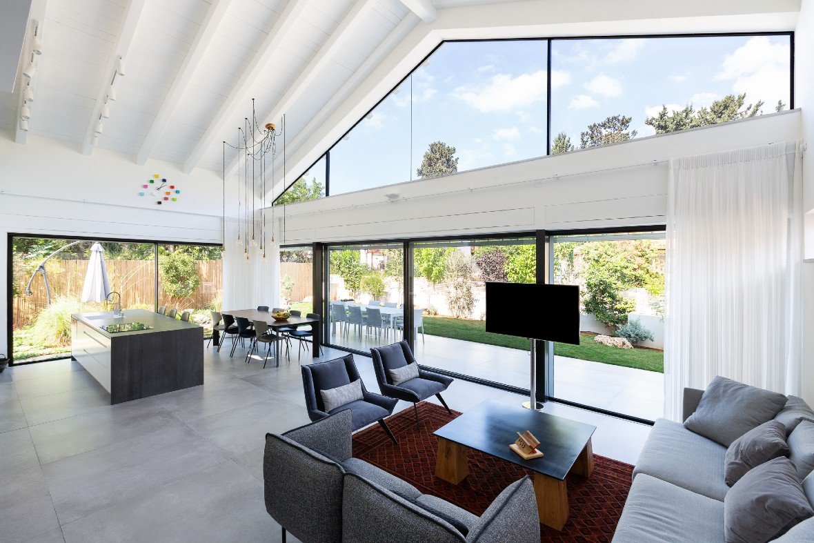 בית ישן בן 65 שנה פינה את מקומו לטובת בית חדש, מרווח ומואר הפונה לגינה מוריקה. בני זוג שילדיהם עזבו את הקן אך מגיעים לעיתים קרובות להתארח, פנו לאורנה שלוש גורביץ על מנת לתכנן ולעצב את הבית החדש. היא מיקמה את כל הפונקציות העיקריות במפלס אחד, שגודלו 130 מ״ר, כך שההתנהלות היומיומית בבית אינה תלויה בגרמי מדרגות. כדי להעצים את תחושת המרחב בחלל הציבורי, תוכננו תקרה גבוהה במיוחד המתנשאת לגובה של 6.5 מטר וחלונות גדולים במיוחד המשקפים את הגינה ואת השמים. גובה התקרה אפשר לבנות קומת גלריה מעל האגף הפרטי, המשמשת לאירוח.