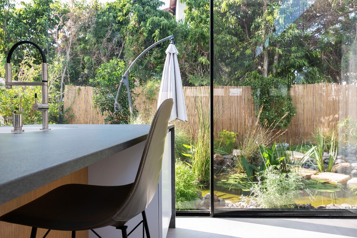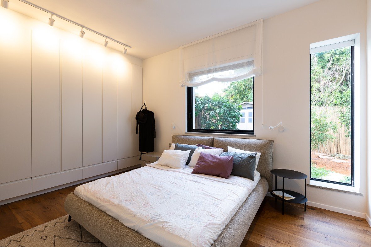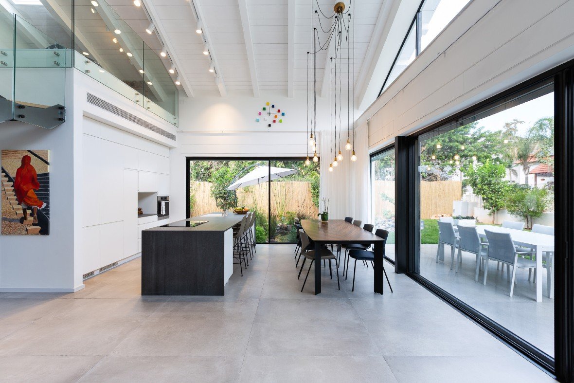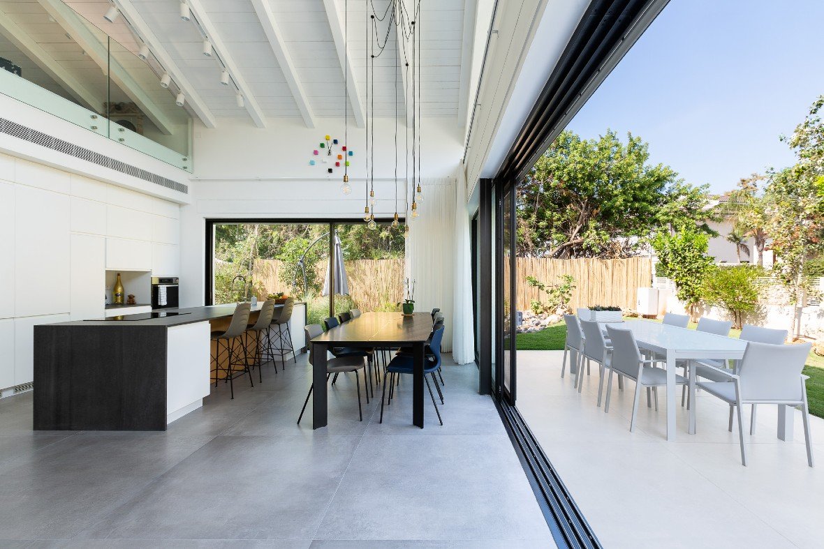 בית ישן בן 65 שנה פינה את מקומו לטובת בית חדש, מרווח ומואר הפונה לגינה מוריקה. בני זוג שילדיהם עזבו את הקן אך מגיעים לעיתים קרובות להתארח, פנו לאורנה שלוש גורביץ על מנת לתכנן ולעצב את הבית החדש. היא מיקמה את כל הפונקציות העיקריות במפלס אחד, שגודלו 130 מ״ר, כך שההתנהלות היומיומית בבית אינה תלויה בגרמי מדרגות. כדי להעצים את תחושת המרחב בחלל הציבורי, תוכננו תקרה גבוהה במיוחד המתנשאת לגובה של 6.5 מטר וחלונות גדולים במיוחד המשקפים את הגינה ואת השמים. גובה התקרה אפשר לבנות קומת גלריה מעל האגף הפרטי, המשמשת לאירוח.