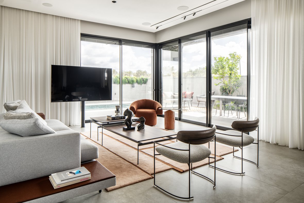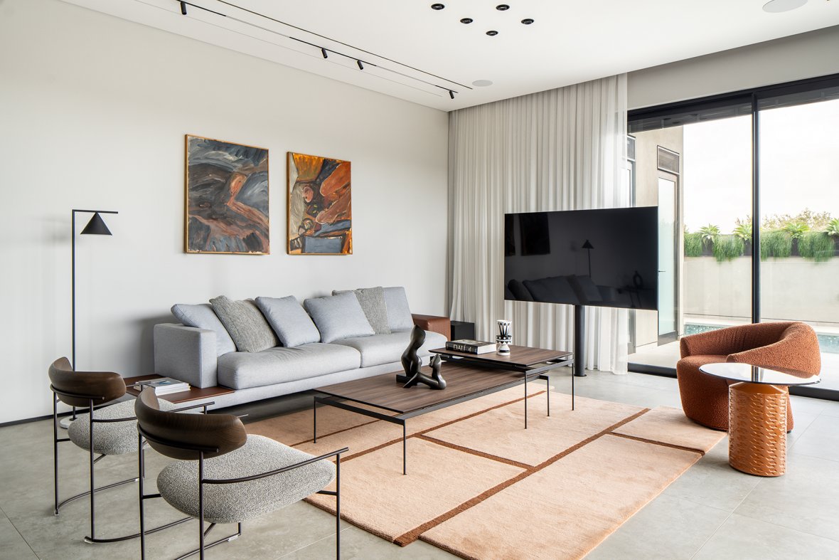 בסלון נבחרו רהיטים בצבעוניות מרשימה המלווים בגוונים עמוקים. הסלון פונה לכיוון החצר האחורית והבריכה ובמקביל לפינת האוכל והמטבח