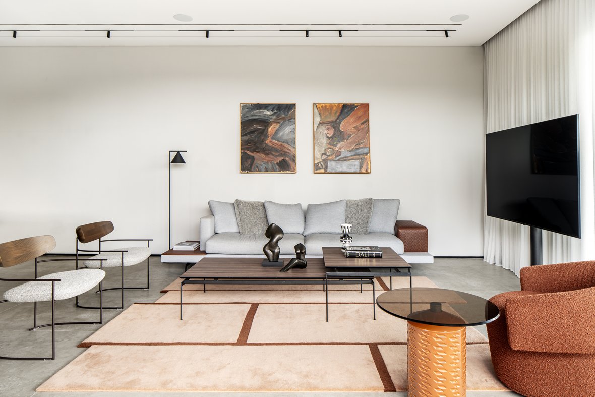 פירוט: ספה דגם isabel, כורסא circus, כורסאות keel, שטיח intersizoni, שולחן קפה זכוכית hishi, כורסא מתנדנדת וכיסאות אוכל קולקצית apelle, שולחן קפה שחור burin.