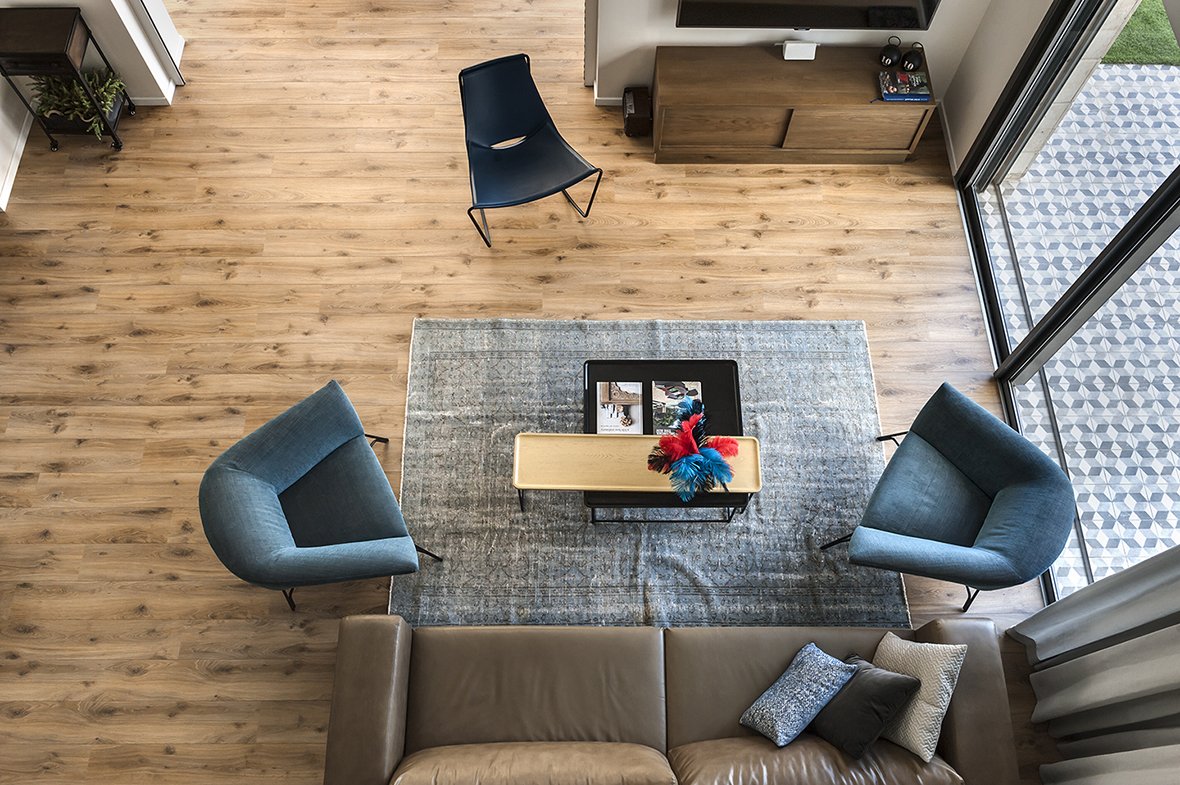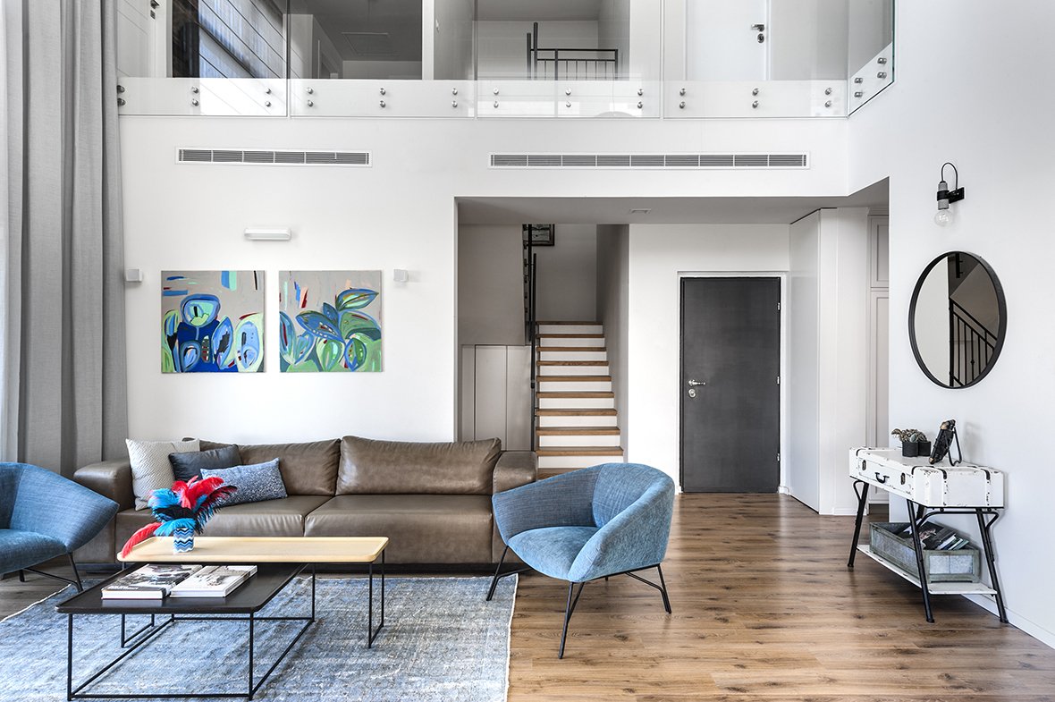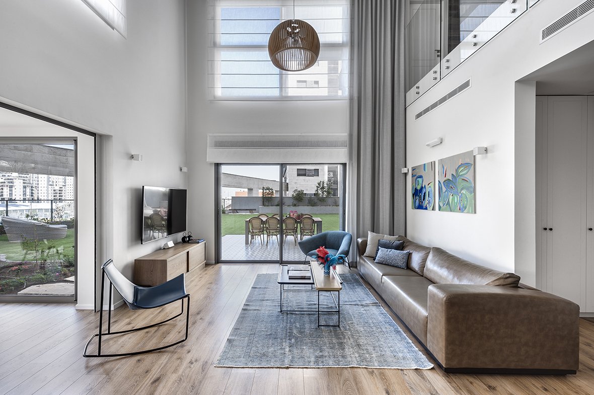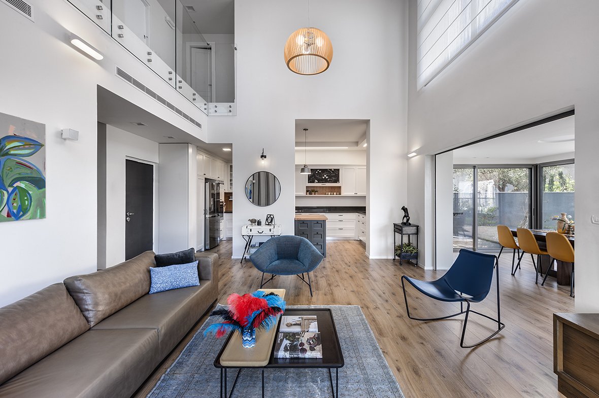 דירת קבלן מרווחת ונעימה ששופצה על ידי שירה מוסקל והדס רוט ממשרד "הלל אדריכלות" לאחר קבלת המפתח. הדיירים, בני זוג וחמשת ילדיהם, ביקשו מהן חלל פונקציונאלי שיתאים לאורח החיים שלהם, כאנשים פתוחים שאוהבים לארח. החלל הציבורי בדירה תוכנן בגובה כפול, אשר דרש מהמתכננות לאזן בין הרצון להעצים את תחושת הגובה והמרחב לבין בקשתם של בני הבית לחלל ביתי, אישי ואינטימי. את המטרה הן השיגו באמצעות פתרונות מתוחכמים למיזוג האוויר ולתאורה בחלל, לצד בחירה מדויקת של רהיטים, טקסטיל ואביזרים משלימים אשר מרככים את האווירה.