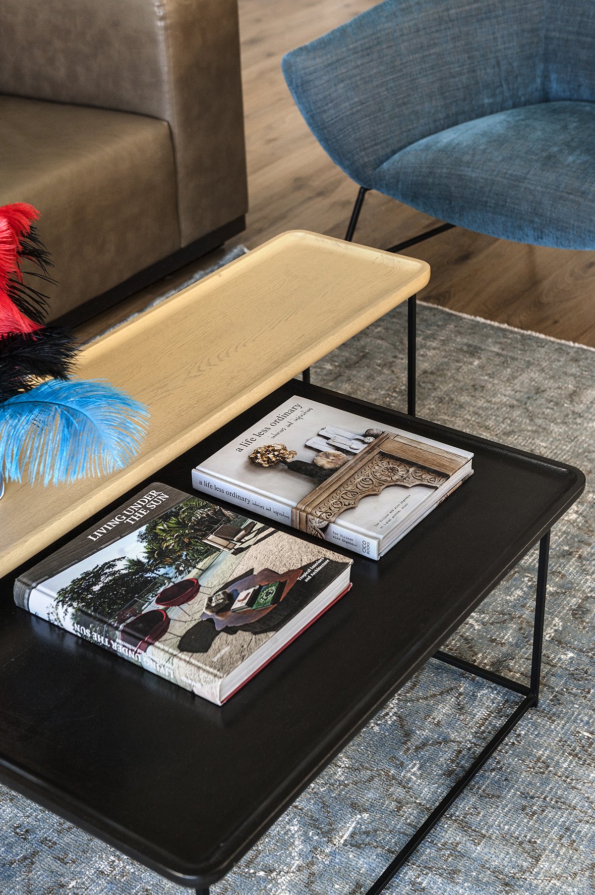 החלל מאופיין בסגנון אקלקטי, המשלב בין אלמנטים כפריים ומודרניים ליצירת איזון הרמוני ונעים. החלל רוצף בפרקט היוצר מראה חמים, אותו מאזנים גוונים תכולים ששולבו, בין היתר, בבד שנבחר עבור הכורסאות מדגם Como ובכיסא נדנדה מדגם Apelle, אשר יוצר תחושה של זרימה ותנועה בחלל. צמד שולחנות קפה מדגם Messa יוצרו באופן מיוחד עבור החלל והותאמו לסקלת הצבעים והחומרים שנבחרה. יחד עם ספת העור ויתר האלמנטים, הם יוצרים קומפוזיציה מעניינת וייחודית.