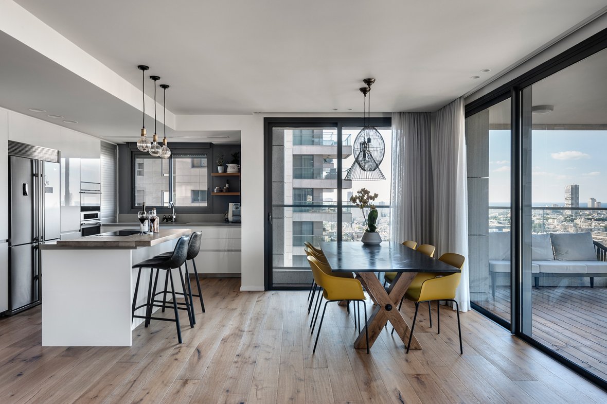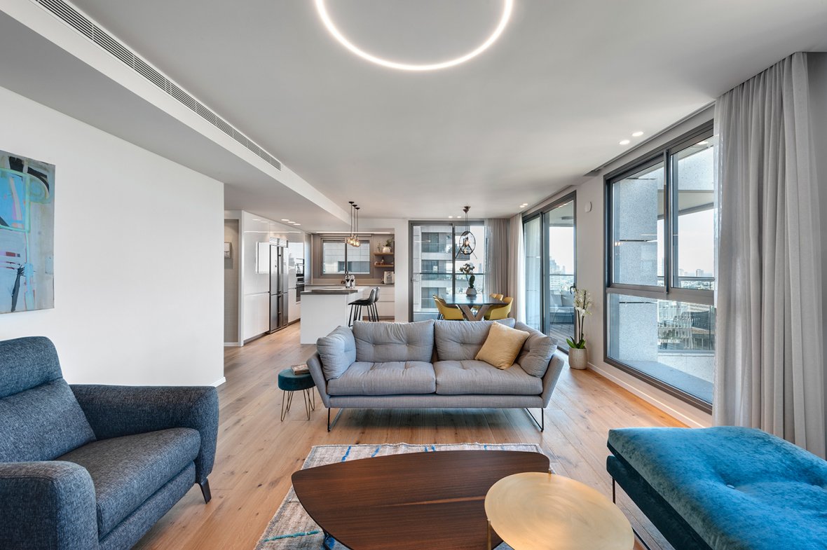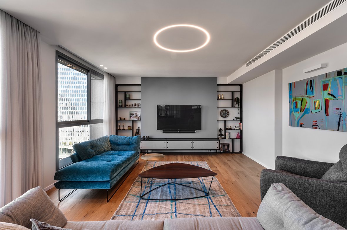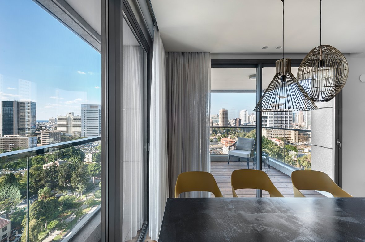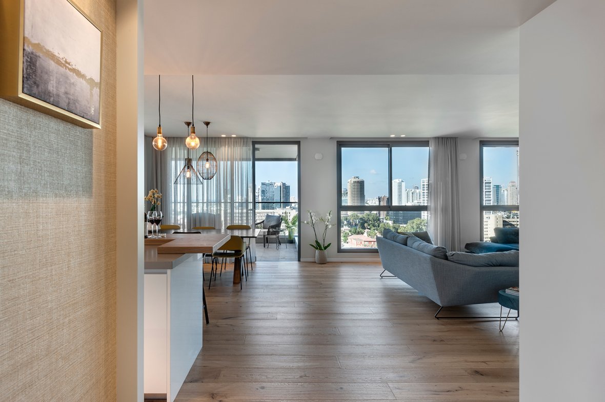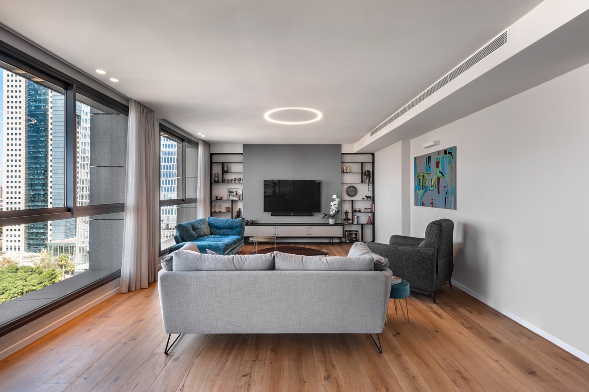 דירת 150 מ"ר במגדלי שרונה, שעוצבה על ידי שירה מוסקל והדס רוט ממשרד הלל אדריכלות עבור בני זוג שעזבו את ביתם ברעננה לטובת המגדל התל אביבי. בתחילת הפרויקט ביקשו הדיירים מהמתכננות עיצוב קלאסי עם טוויסט, כלומר בסיס ניטראלי ועל זמני עם נגיעות צבע קלילות ומשמחות. לשם הגדלת החלל הציבורי הוחלט לוותר על חדר שינה אחד, כך נוצר חלל מרווח ופתוח עם חלונות גדולים הפונים למתחם הרבגוני.