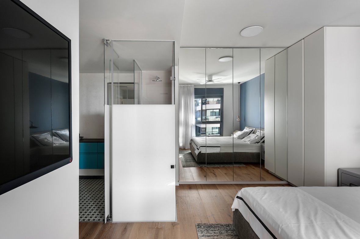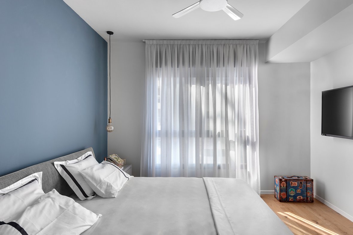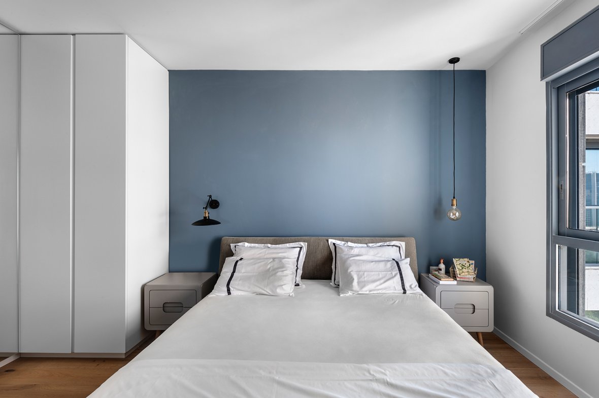 בקצה הסלון עוצב קיר דומיננטי עם ספריית ברזל ומזנון מבטון, מולו הוצבו ספה ושזלונג מדגם Claudia אשר רופדו בגוונים שונים, הספה באפור המתחבר לקירות החלל והשזלונג בכחול המוסיף לסלון צבע ואופי. ביניהם שולחן סלון Guapa מעץ ומברזל המשתלב גם הוא עם חומרי הגמר שנבחרו עבור הדירה. בצד השני של החלל, מול המטבח, מוקמה פינת האוכל הכוללת שולחן מדגם Beton המעשיר את עיצוב החלל בנגיעה של עיצוב תעשייתי ומתחבר לאלמנטים מהברזל ששולבו ברחבי הבית. בחדר השינה של בני הזוג חוזרת אותה צבעוניות שבאה לידי ביטוי בסלון, הקיר האחורי נצבע בגוון תכול ועוצבה מיטה מרופדת באפור בעיצוב נקי ומודרני.