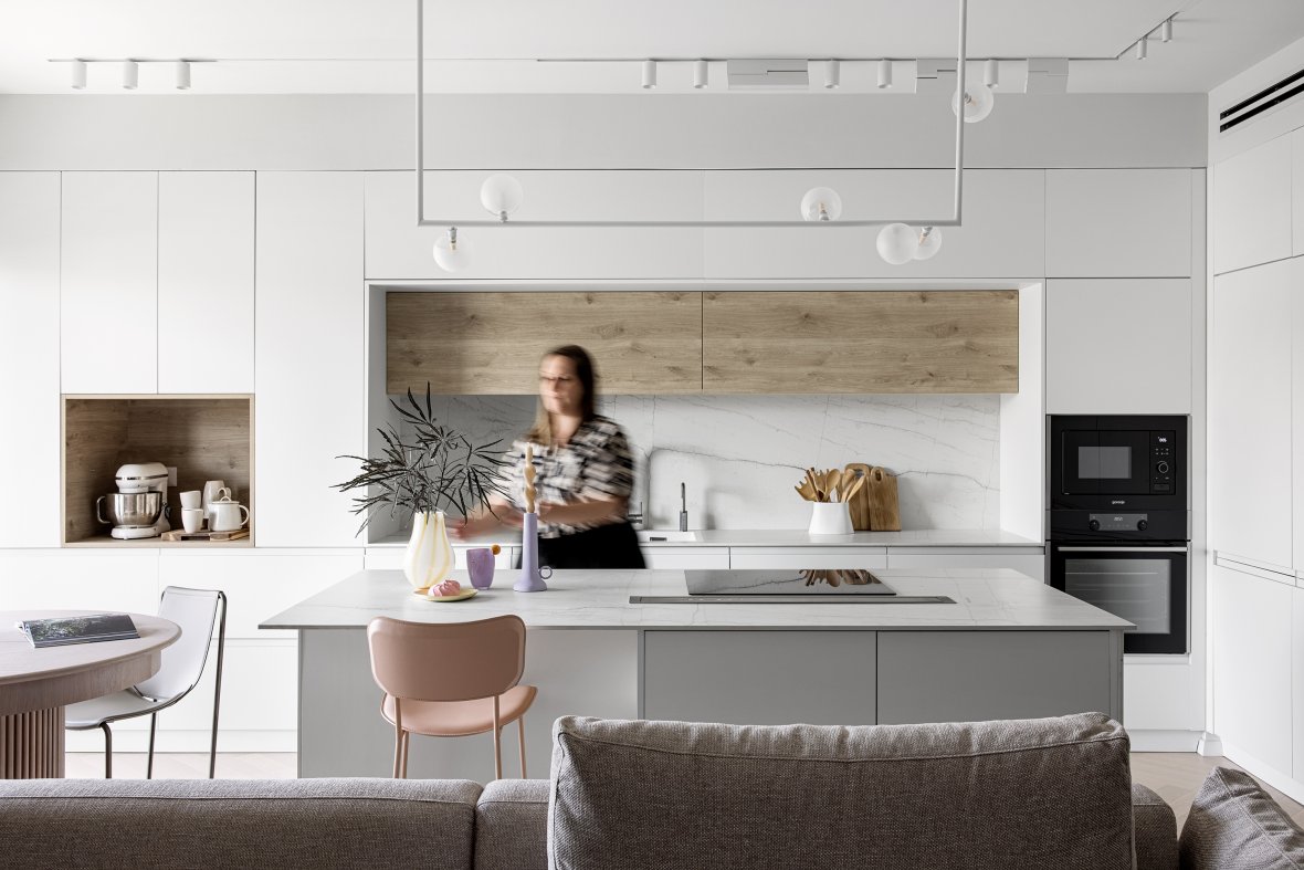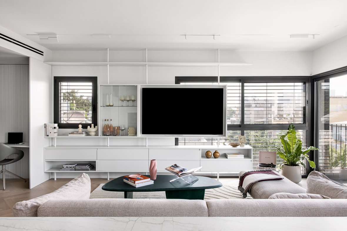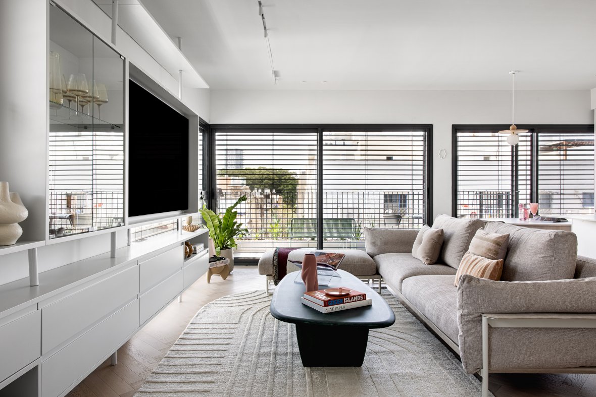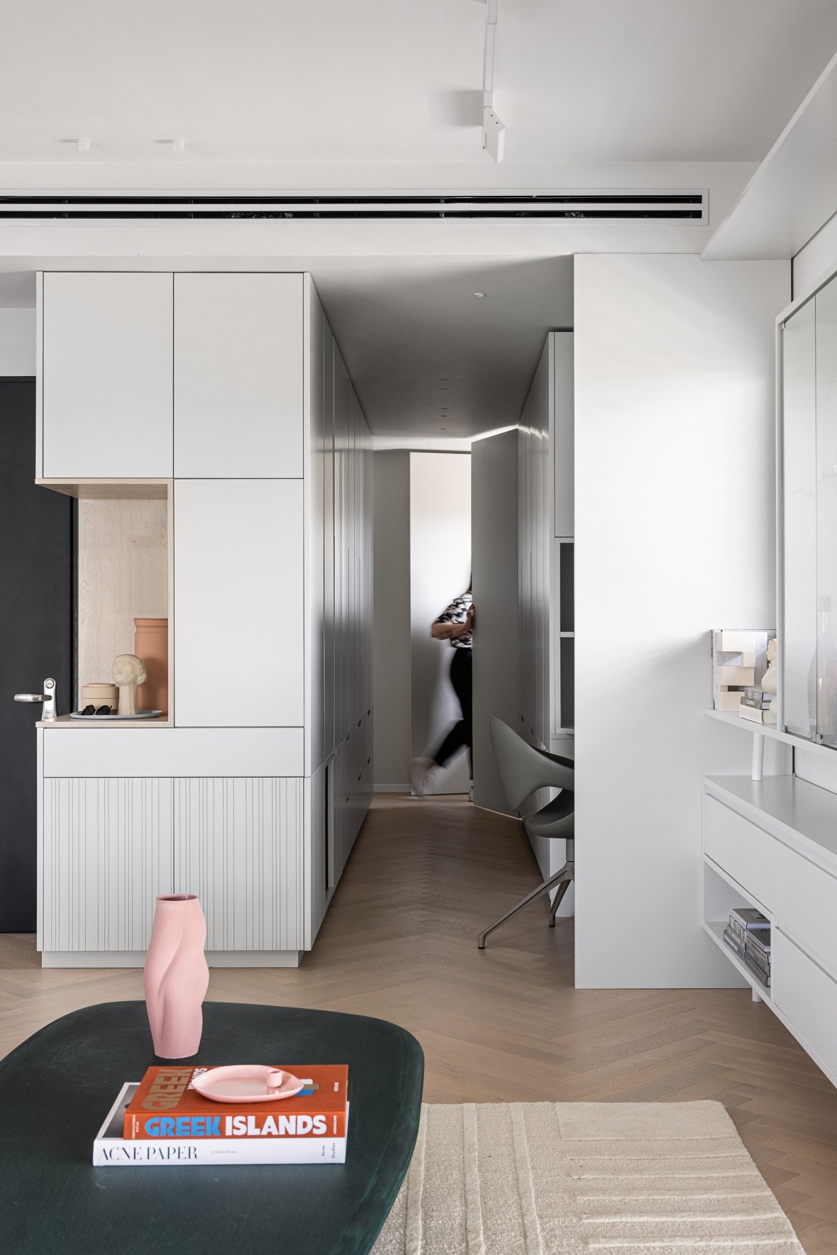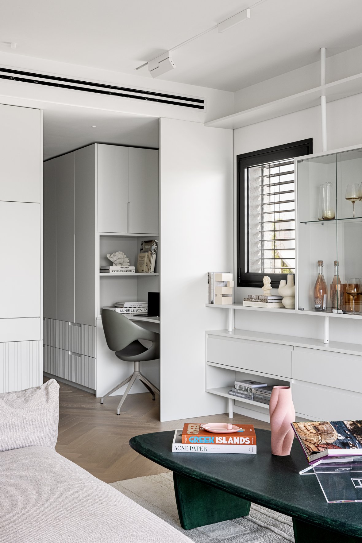פתרונות רבים נוצרו בעבור דירה זו, מעבר רב שימושי ובו פינת עבודה נסתרת, אזור כביסה סמוי ואחסון מרובה המשחרר את חדרי השינה מהצורך באחסון מרובה והפך אותם למרווחים יותר. הדירה מוצפת אור טבעי מ-3 כיווני אוויר, וניבט ממנה נוף ירוק סמי-פראי כמו שרק פארק הירקון יכול להציע.