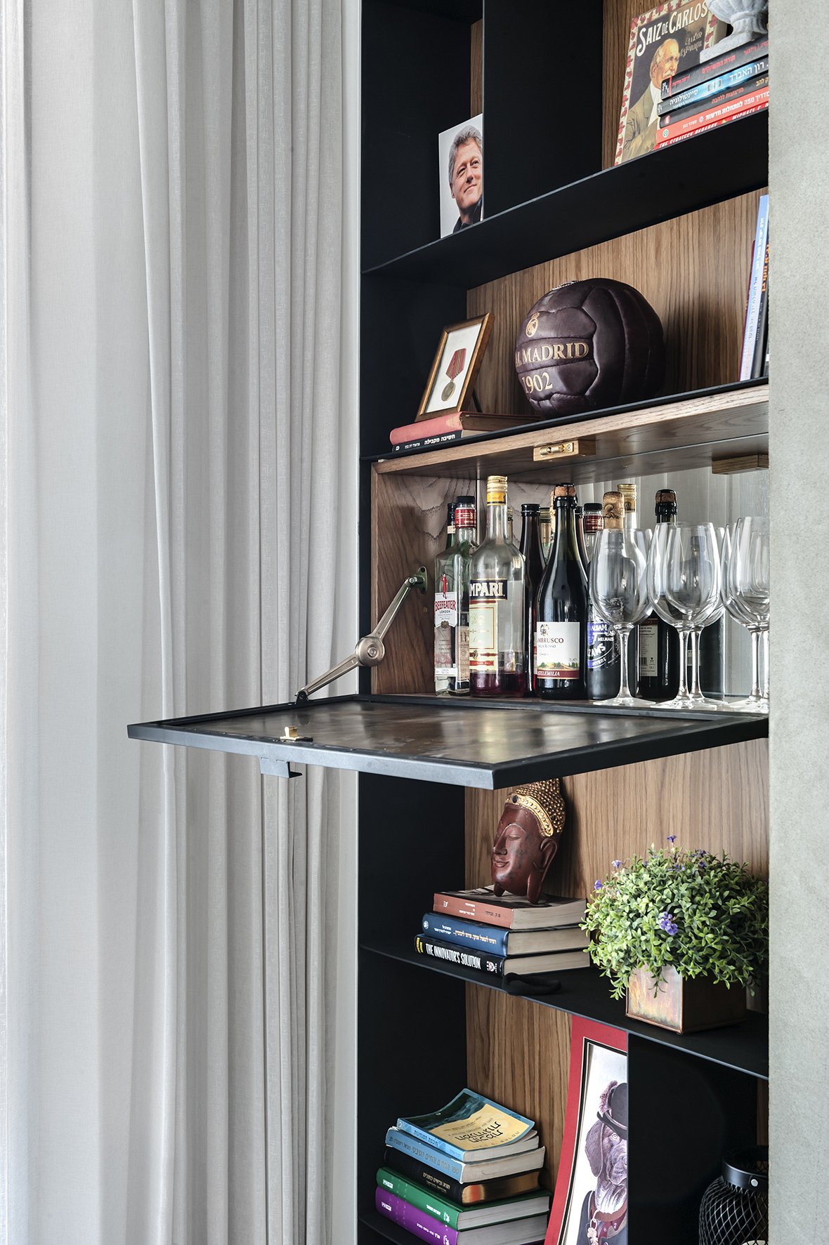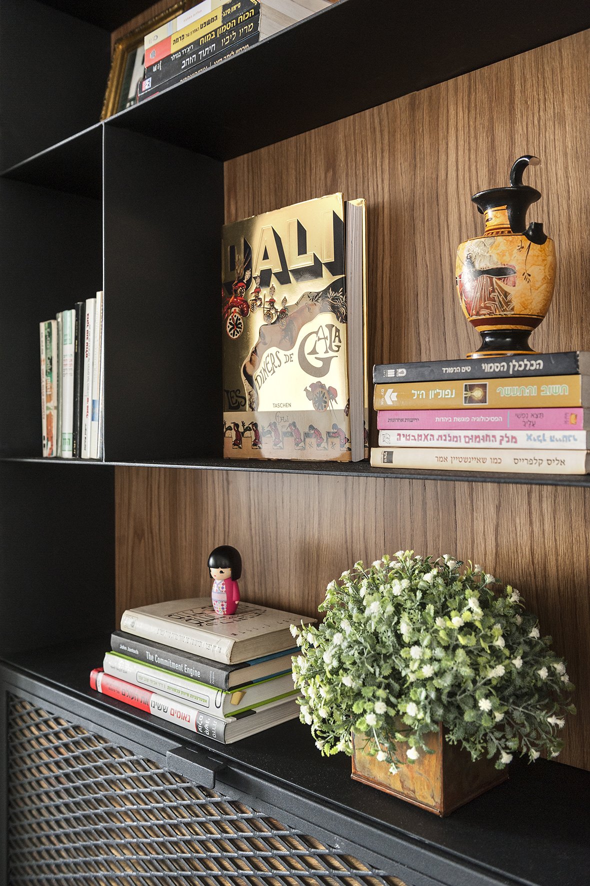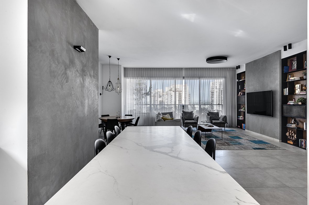בסלון תכנן הצוות שלנו יחד עם שירה והדס ספרייה ייחודית משני צידי הטלוויזיה, בעיצוב א-סימטרי ובשילוב של עץ וברזל מושחר. חלק ניכר מהיחידה הוקדש לתצוגה של ספרים וחפצי נוי ואזורים ספציפיים הוקצו לאחסון, אחד מהם משמש כבר משקאות לאירוח. ספה אפורה מדגם Mirage הוצבה מול הקיר המיוחד, לצידה צמד כורסאות מדגם Anushka ובמרכז החלל שולחן סלון בהזמנה מיוחדת. מאחורי הסלון ניצבת פינת אוכל, עבורה ייצרנו לפי הזמנה שולחן אוכל מעוגל. במטבח תוכנן אי גדול ומרווח, סביבו הוצבו כיסאות שחורים מדגם Gotham, היוצרים קונטרסט לצד הגוונים הבהירים שנבחרו בחלל.