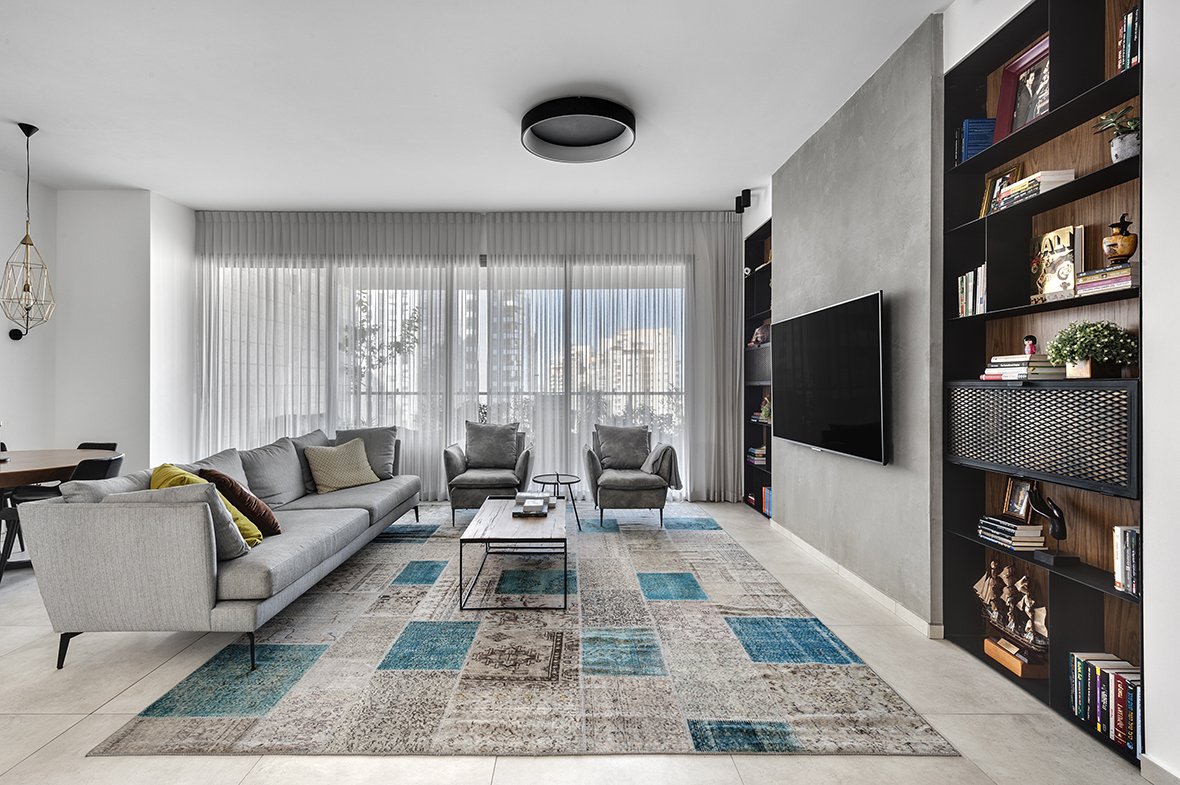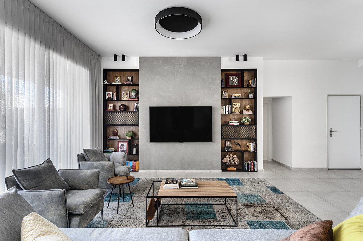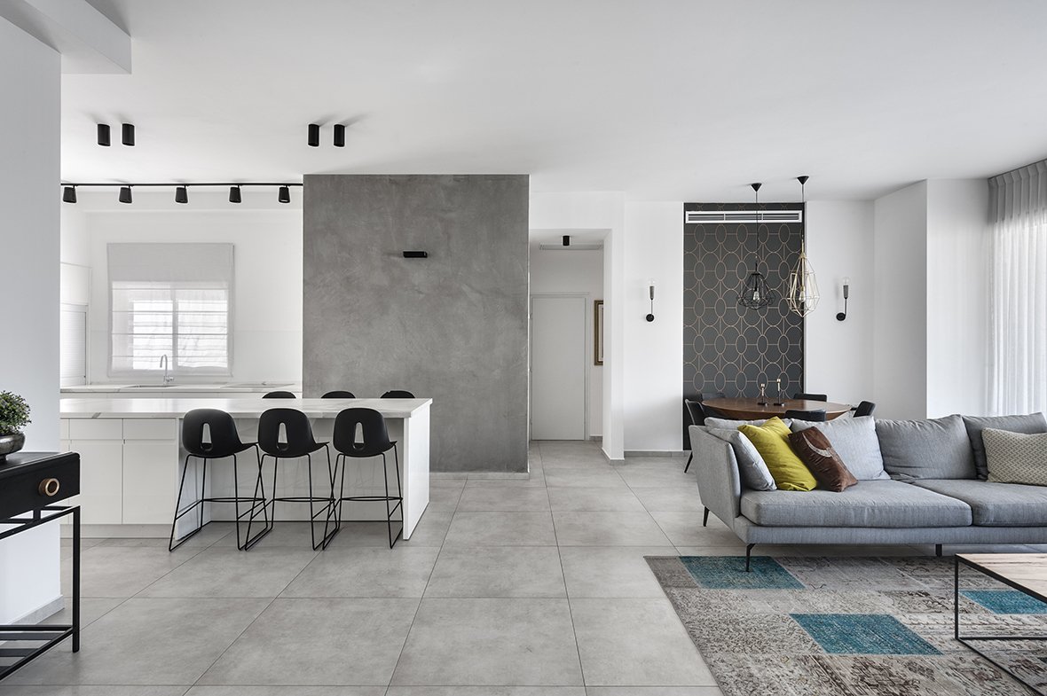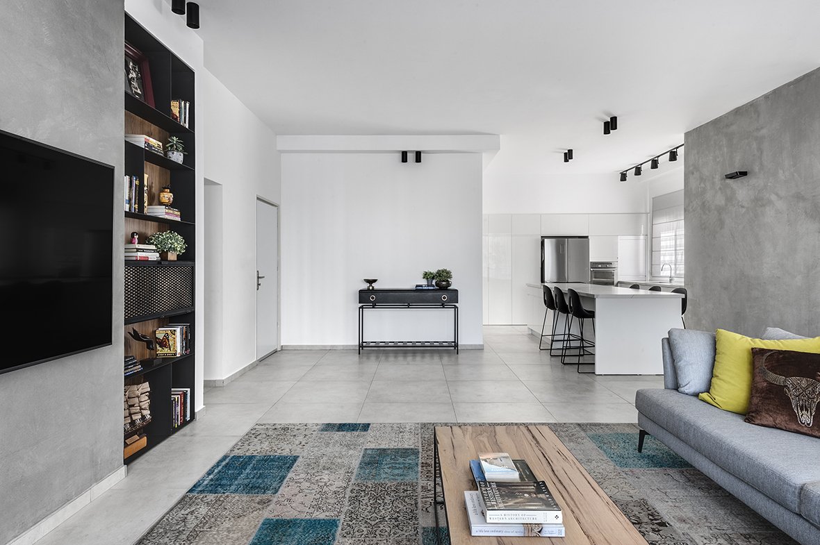 הדירה הזו היא הוכחה לכך שגם בעזרת שיפוץ קליל ועיצוב מדויק אפשר לקבל תוצאה ייחודית, אישית ויצירתית. משפחה בת חמש נפשות רכשה את דירת הקבלן הזו ופנתה לשירה מוסקל והדס רוט ממשרד "הלל אדריכלות", על מנת לשנות את פניה ולהקנות לה אופי וסגנון. השיפוץ נעשה לאחר קבלת המפתח ועיקר ההשקעה היה בתכנון מחודש לחלל המרכזי ולהדגשת חלקים נבחרים ממנו בעזרת תכנון נגרות ושילוב חיפויים מעניינים.