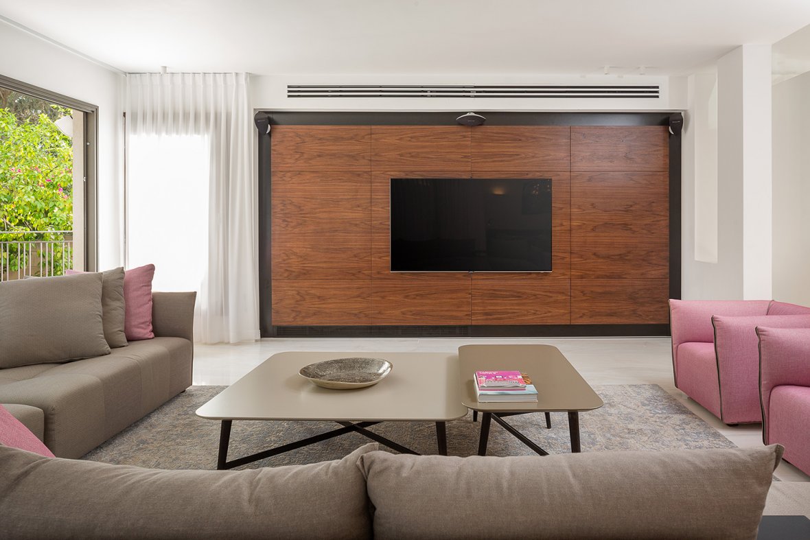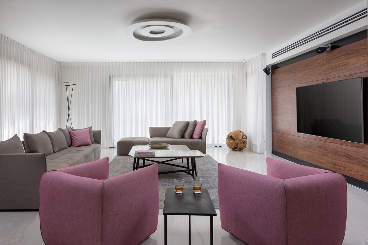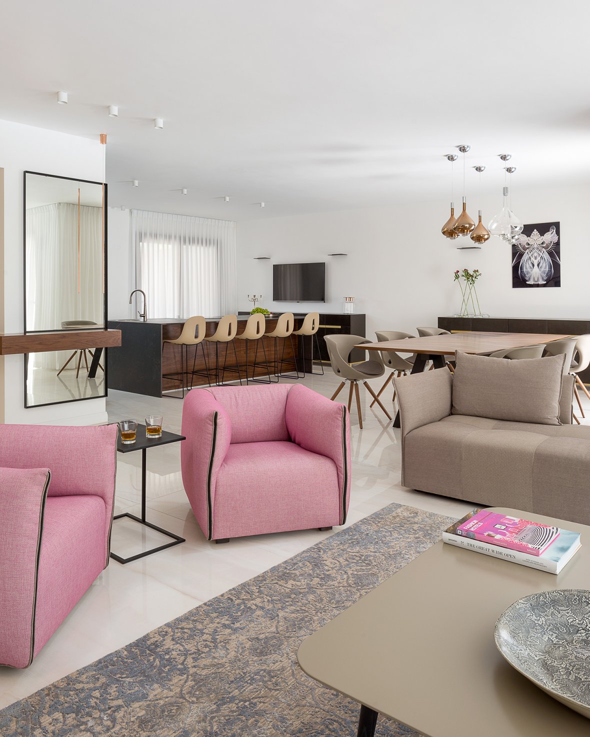 הסלון נמצא מימין לכניסה ועוצב כחלל מזמין ומפנק המאפשר ישיבה נוחה לכל בני המשפחה ואורחיהם. ספה גדולה ושזלונג מדגם Collage בגוון אפור מספקים מקומות ישיבה רבים ונוחים ולצידם הוצבו צמד כורסאות עמוקות מדגם Ann, עבורן נבחר בד ריפוד בגוון ורדרד המקנה לחלל מראה צעיר ויצירתי. זוג שולחנות קפה Smith בגוון ניטראלי ניצבים במרכז הסלון ומשלימים את עיצוב החלל האלגנטי.