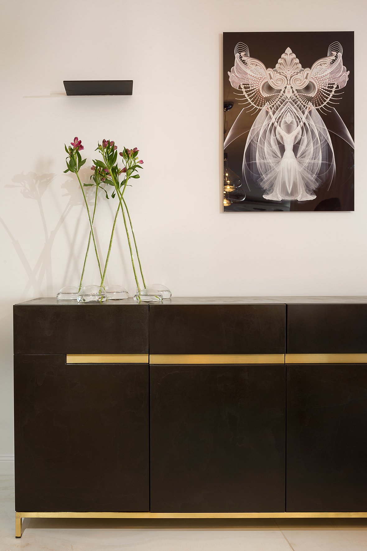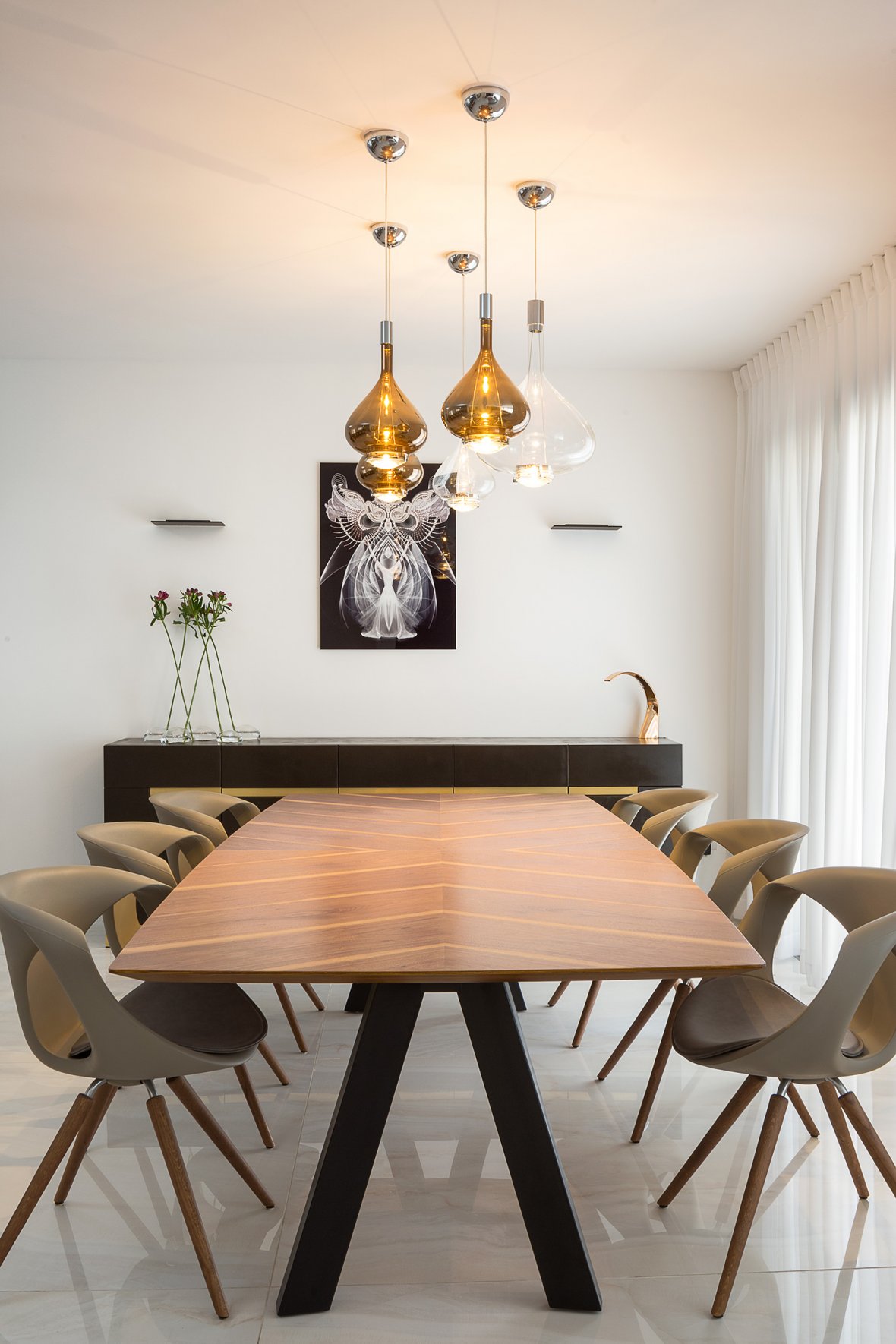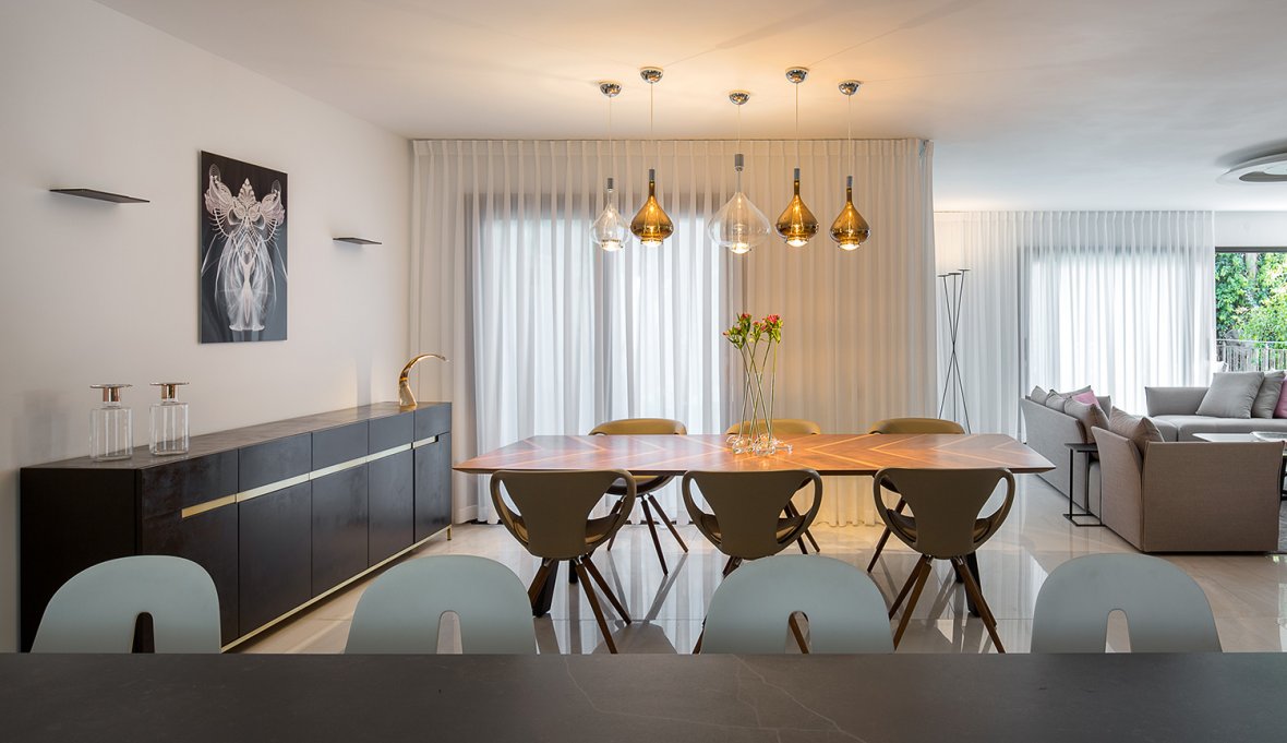 בית פרטי בקרית אונו בן 13 שנה אשר שופץ כדי להתאים לאופי ולסגנון של בני המשפחה, זוג הורים ושלושת ילדיהם. הם ביקשו ממעצב הפנים עמירם ביטון חלל ציבורי מרווח שיאפשר להם להתכנס ולבלות יחד וכן חללים פרטיים נעימים להורים ולילדים. המרתף הוסב לקומת מגורים עבור הבנות הגדולות וכך התפנה שטח בקומת הקרקע לטובת חלל האירוח. מיד עם הכניסה לבית ניתן להתרשם מפינת האוכל הגדולה, שולחן Noce בגוון עץ אגוז אמריקאי על גבי רגלי מתכת, סט כיסאות בייבוא אישי מאיטליה בגוון אפור עם רגלי עץ ומזנון שיוצר לפי הזמנה לתוספת אחסון. מול פינת האוכל נמצא המטבח, בו לאורך האי המרכזי שולבו כיסאות מדגם Gotham בגוון בהיר וחם עם רגליים שחורות, גם הם בייבוא מאיטליה. מזנון תואם לזה שבפינת האוכל עוצב ויוצר עבור החלל והוצב מתחת לטלוויזיה.